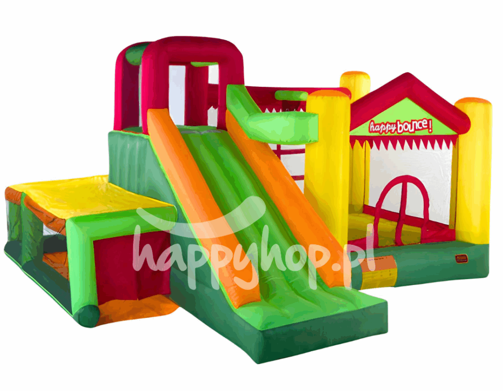 Multi Centrum 9w1 to ciekawa atrakcja na każdą okazję. Po wejściu na zamek znajdziecie trampolinę dmuchaną, po wyskakaniu się dzieci mogą wspinać się na ścianie wspinaczkowej. Po wspięciu się na szczyt dmuchańca maluchów czeka już tylko ekstra zjazd na zjeżdżalni – i tak cały dzień! To zabawa, która nigdy się nie nudzi i dostarcza niezapomnianych wrażeń. Przy zjeżdżalni znajduję się tunel a w strefie skakania kosz.
